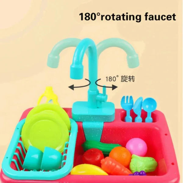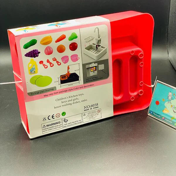 1 Kitchen sink, 1 base, 4 plastic cups, 2 plastic plates, 1 brush, 2 soft plastic knives, 1 play detergent, 1 faucet, 1 dish rack
